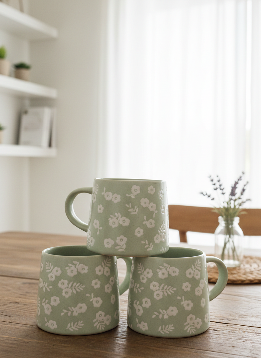 ماگ سرامیکی تکرنگ خوشدست با طرح گلهای سفید در پری شاه استور
